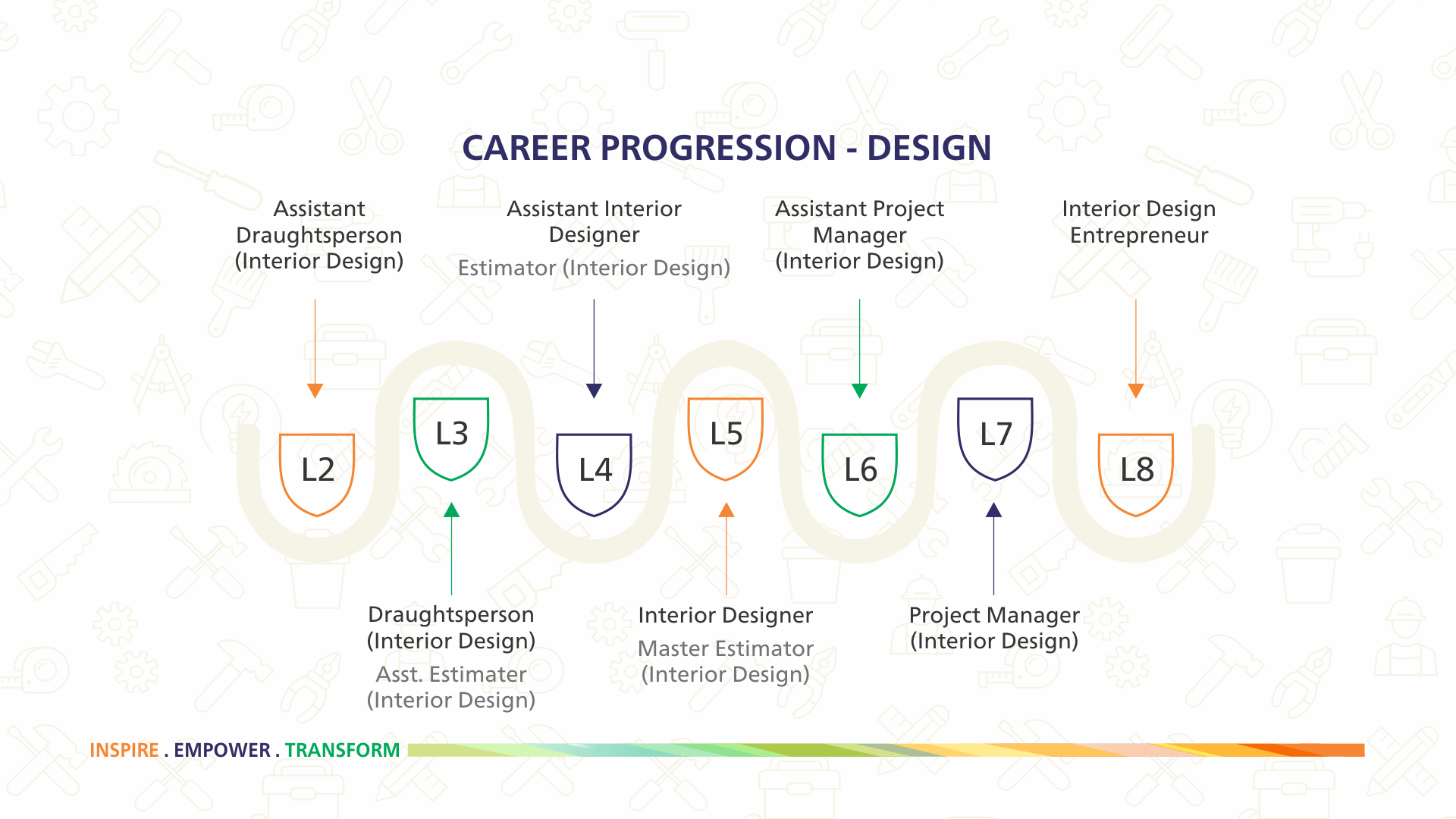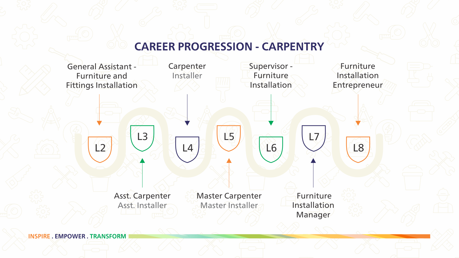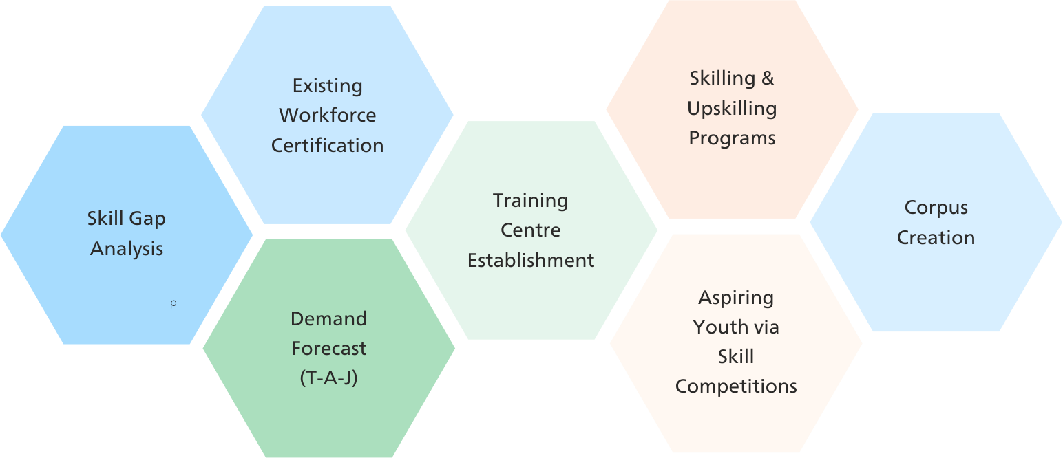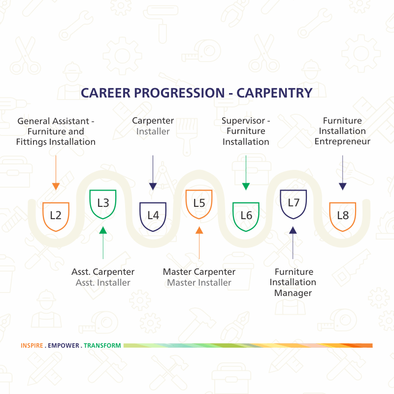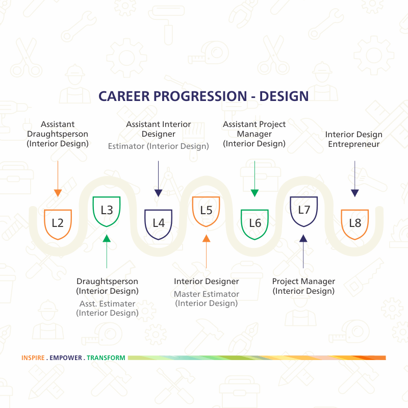 The career progression of different job roles has also been defined from the Occupational Map. The career progression path shows both horizontal and vertical progression in any occupation.