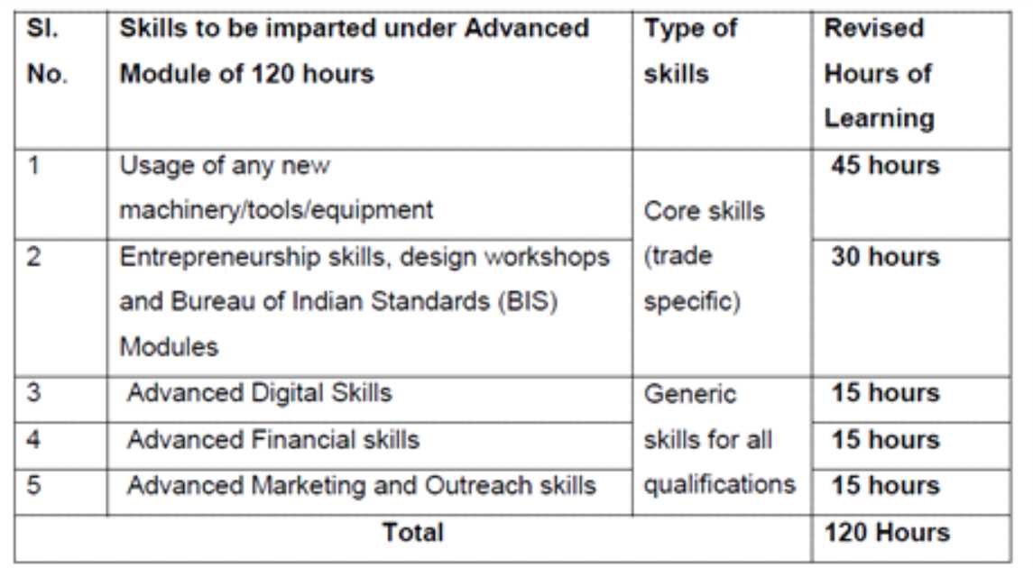 - Under the directives of Ministry of Micro, Small & Medium Enterprises (MSME), the durations of PM Vishwakarma Advanced Training modules originally approved in 34th NSQC meeting were revised to the following:
