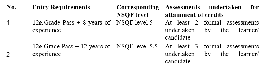 - Based on the SOP relating to VETS detailing out credits applicability, the validity of the credits earned after undergoing training in a NSQF aligned and approved qualification will depend on the type of VETS qualification. In case a student/ learner wishes to redeem the credits earned after the validity of the credits for a Skill-based course/ qualification has expired, they may go for re-validation of the credits of the course/ qualification through a well-defined assessment mechanism like RPL. The NSQC committee took a note of it and proposed that the parameter ‘Validity of the Credit Earned’ may be included as a mandatory criterion for NSQF alignment and approval of the qualifications. Suitable modifications would therefore be undertaken in the Qualification file template.