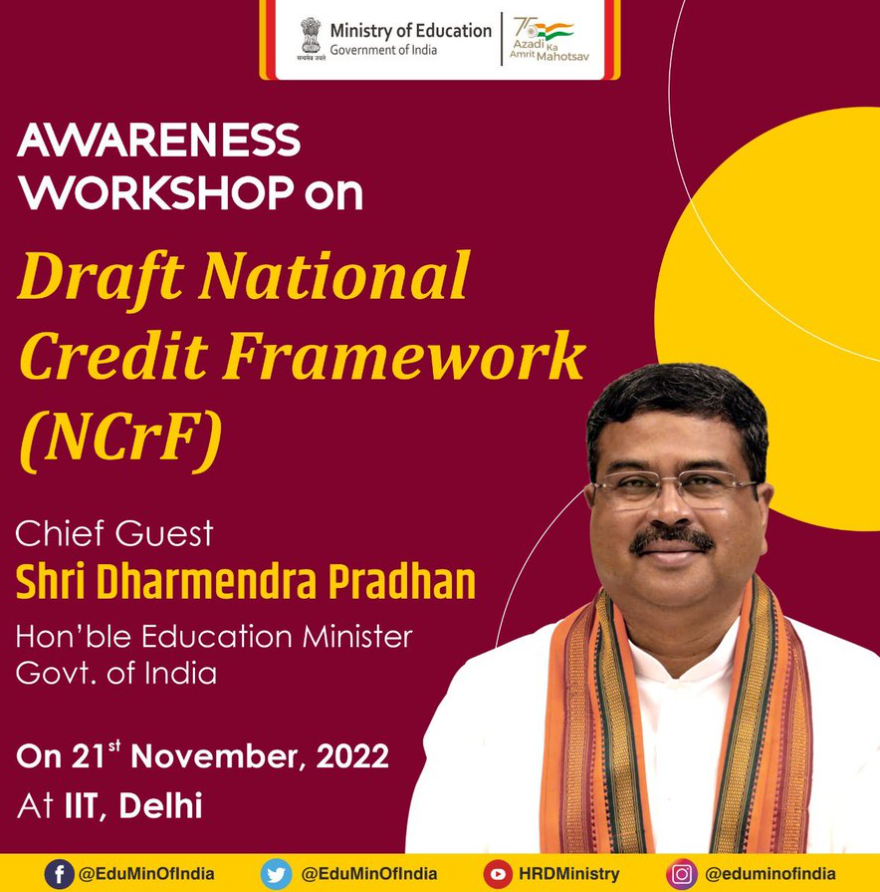 Union Minister of Education and Minister of Skill Development and Entrepreneurship Mr. Dharmendra Pradhan launched a draft of National Credit Framework (NCrF) on October 19th in New Delhi for public consultation. Propagating the vision of National Education Policy (NEP) NCrF enables the integration of academic and vocational eductaion. Mr. Pradhan said that the NCrF would act as an umbrella for skilling, upskilling, re skilling, accredation and evaluation encompassing our people in eductaion and skilling institutions.